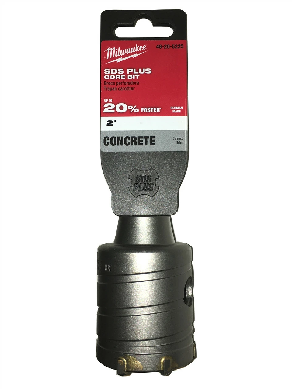 Milwaukee SDS-Plus Masonry Core Bits are ideal for drilling large holes in brick, block, and concrete with SDS-Plus rotary hammers. Asymmetrical carbide teeth break up material more effectively resulting in up to 20 Percent faster drilling speeds. Centering bits allow for easy alignment of the hole and precise spot drilling. The versatile two-piece design allows users to drill with several different core bit sizes using one adapter. The spiral core body design minimizes friction in the hole and aids in dust removal during the application. Core bits cut with the outer edge only, therefore the operator must remove the inner core continue drilling for holes deeper than 2 in.