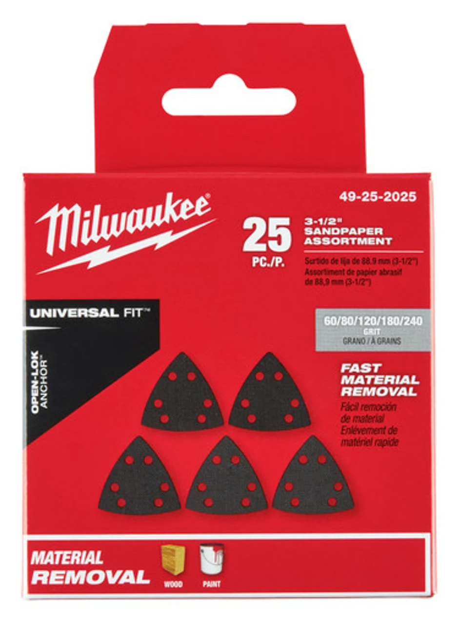 Our Universal Fit OPEN-LOK 3-1/2 in. Triangle Sandpaper 25 Piece Variety Pack is designed for Oscillating Multi-Tools. The MILWAUKEE 3-1/2 in. Triangle Sandpaper utilizes hook and loop technology for fast and secure paper changes. The universal hole placement allows for use with dust extraction systems. This kit includes 60 grit, 80 grit, 120 grit, 180 grit, and 240 grit silicon carbide sandpaper ideal for paint removal and wood sanding, helping you gain access in hard to reach areas.